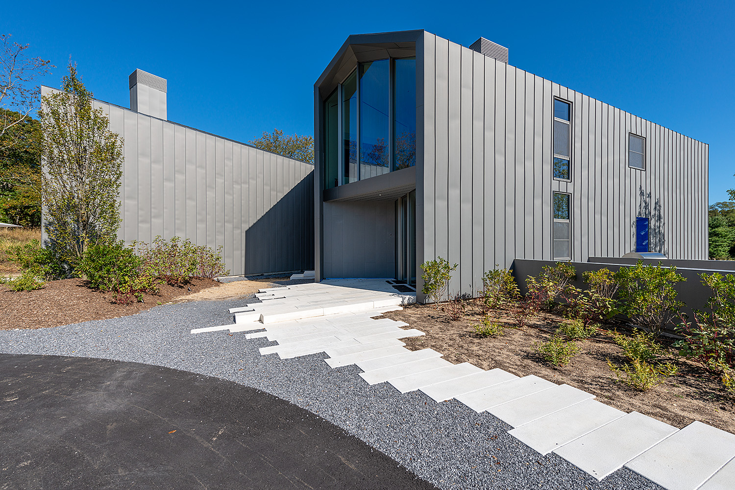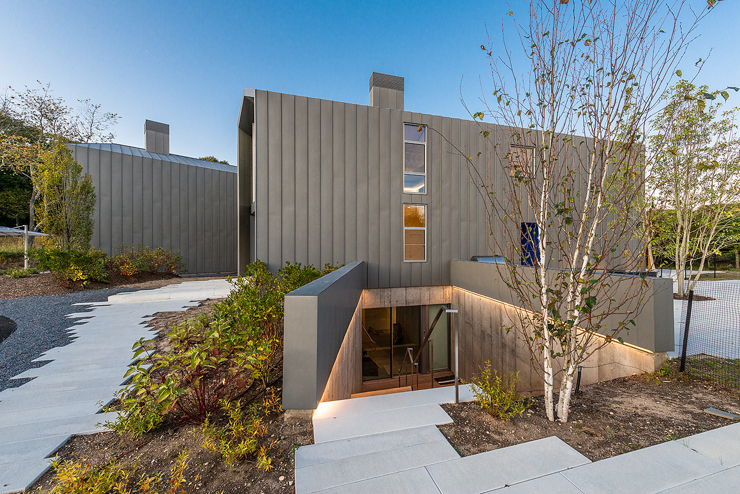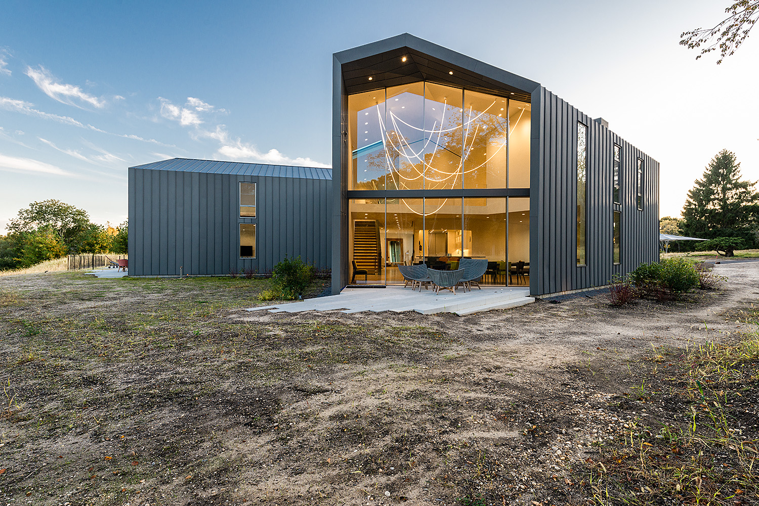A compound of minimalist contemporary structures clad ground-to-roof in integrated EL Zinc panels. Includes custom sculptural interior lighting.
