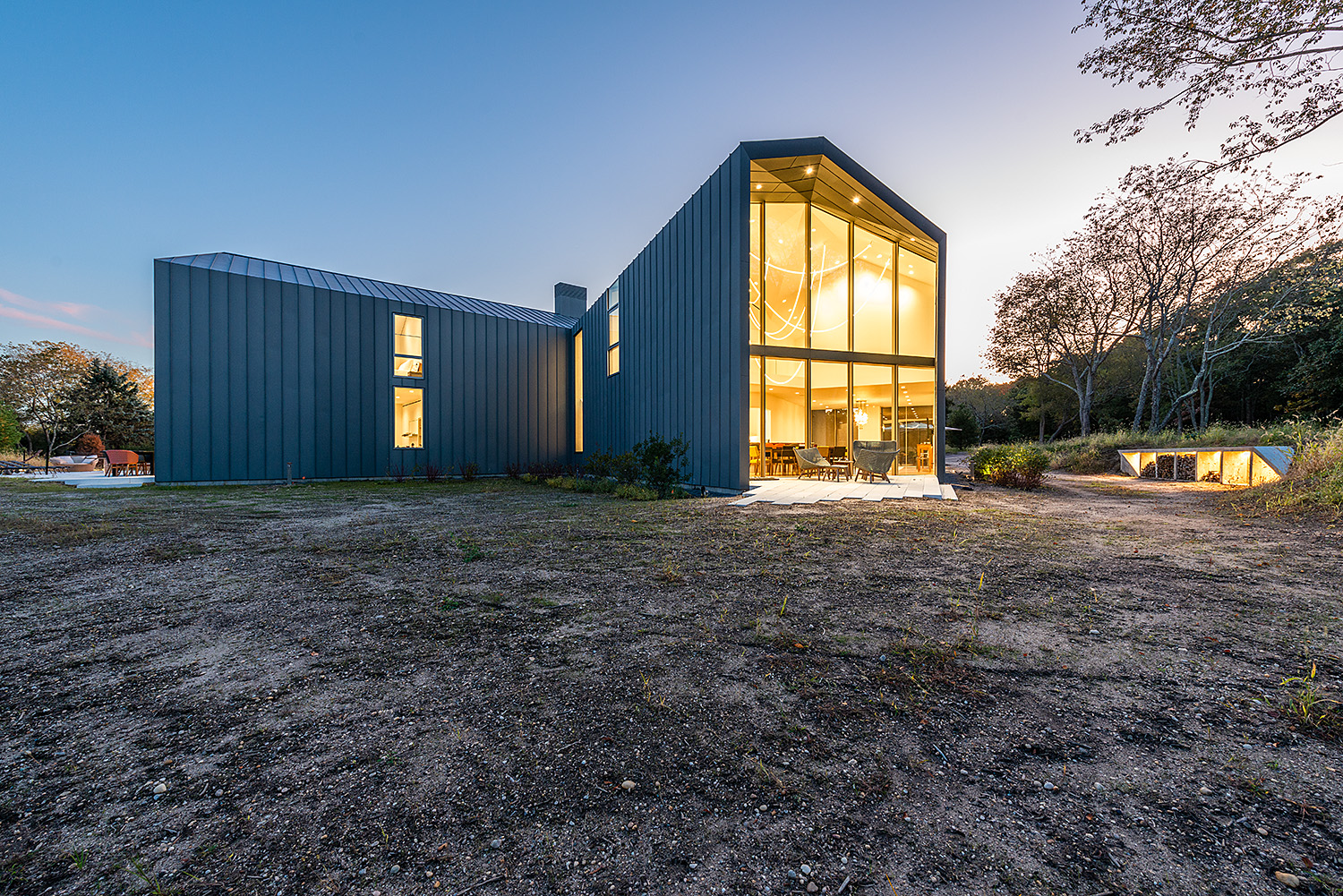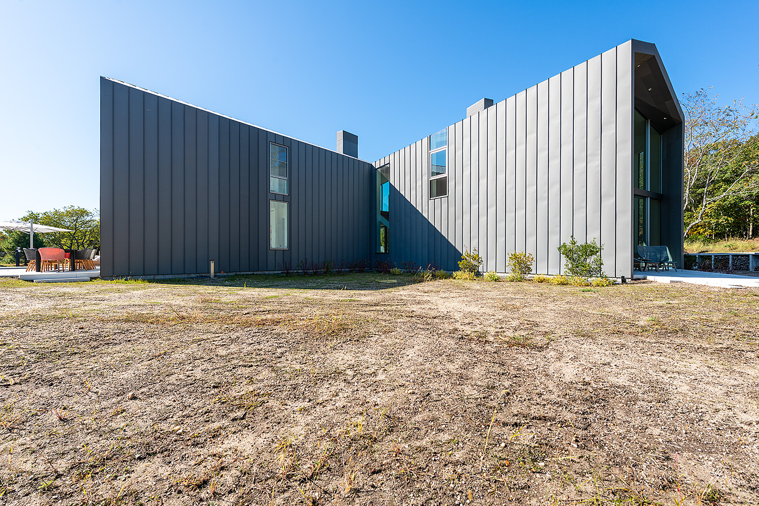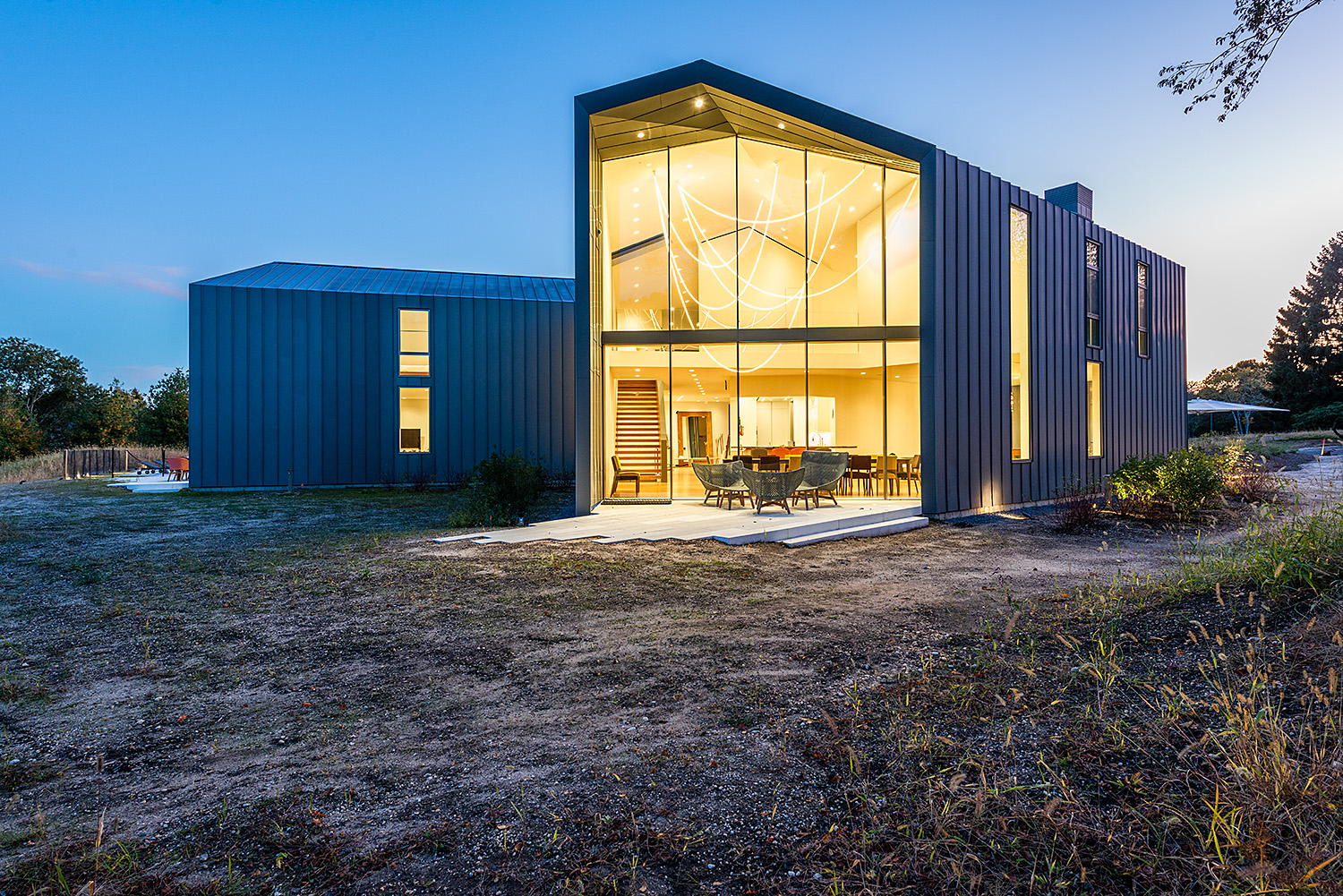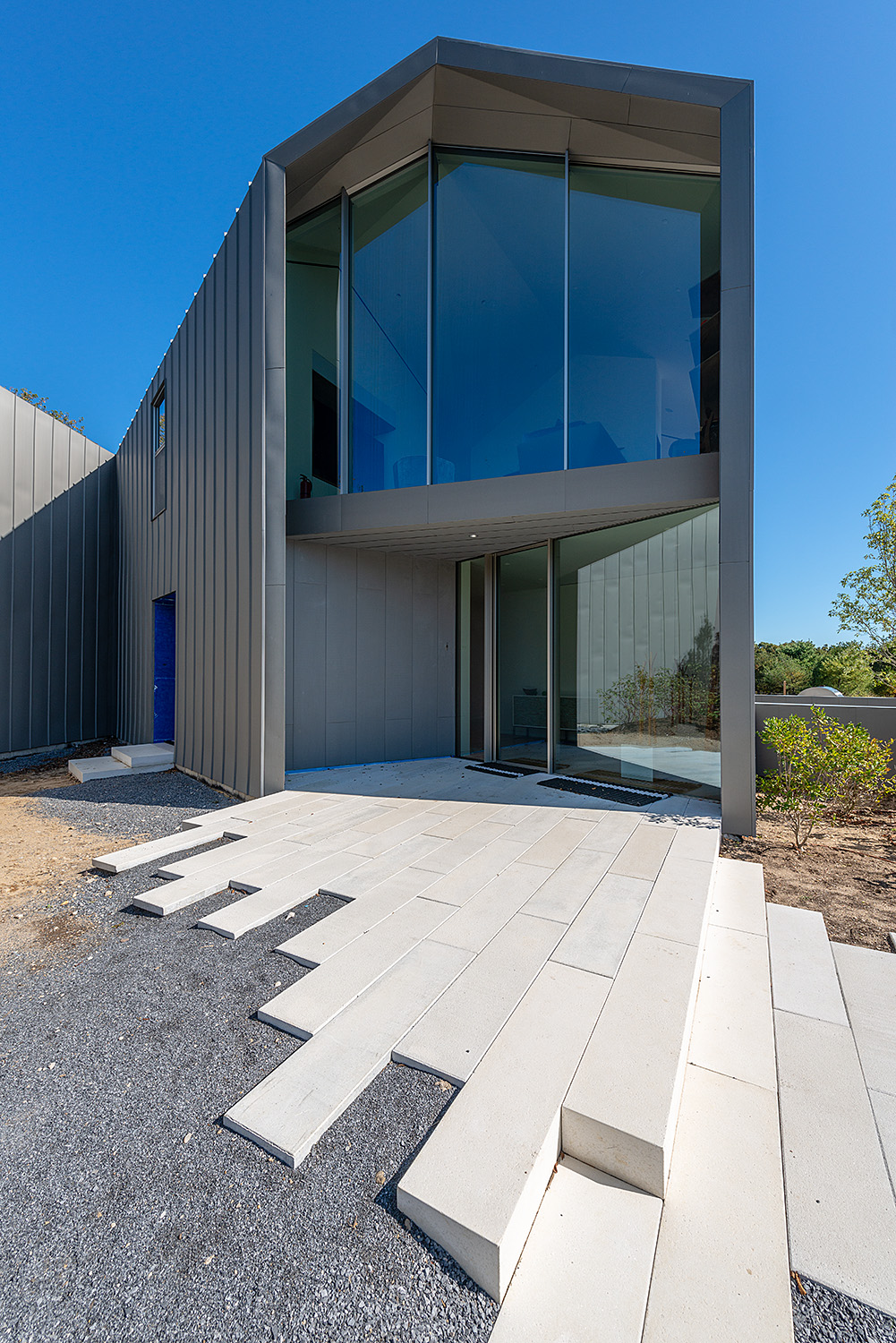 A compound of minimalist contemporary structures clad ground-to-roof in integrated EL Zinc panels. Includes custom sculptural interior lighting.