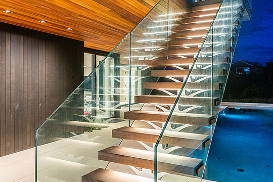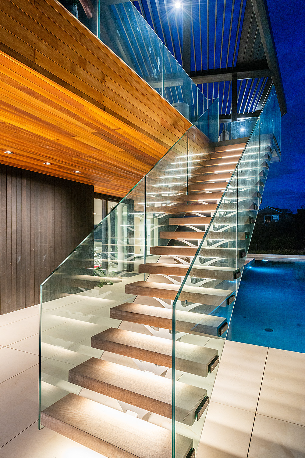 • Features: Floor to ceiling windows and doors, AGS frameless interior doors, Retractable skylight over exterior staircase, Stainless steel exterior stair, Trellis with operable louvers