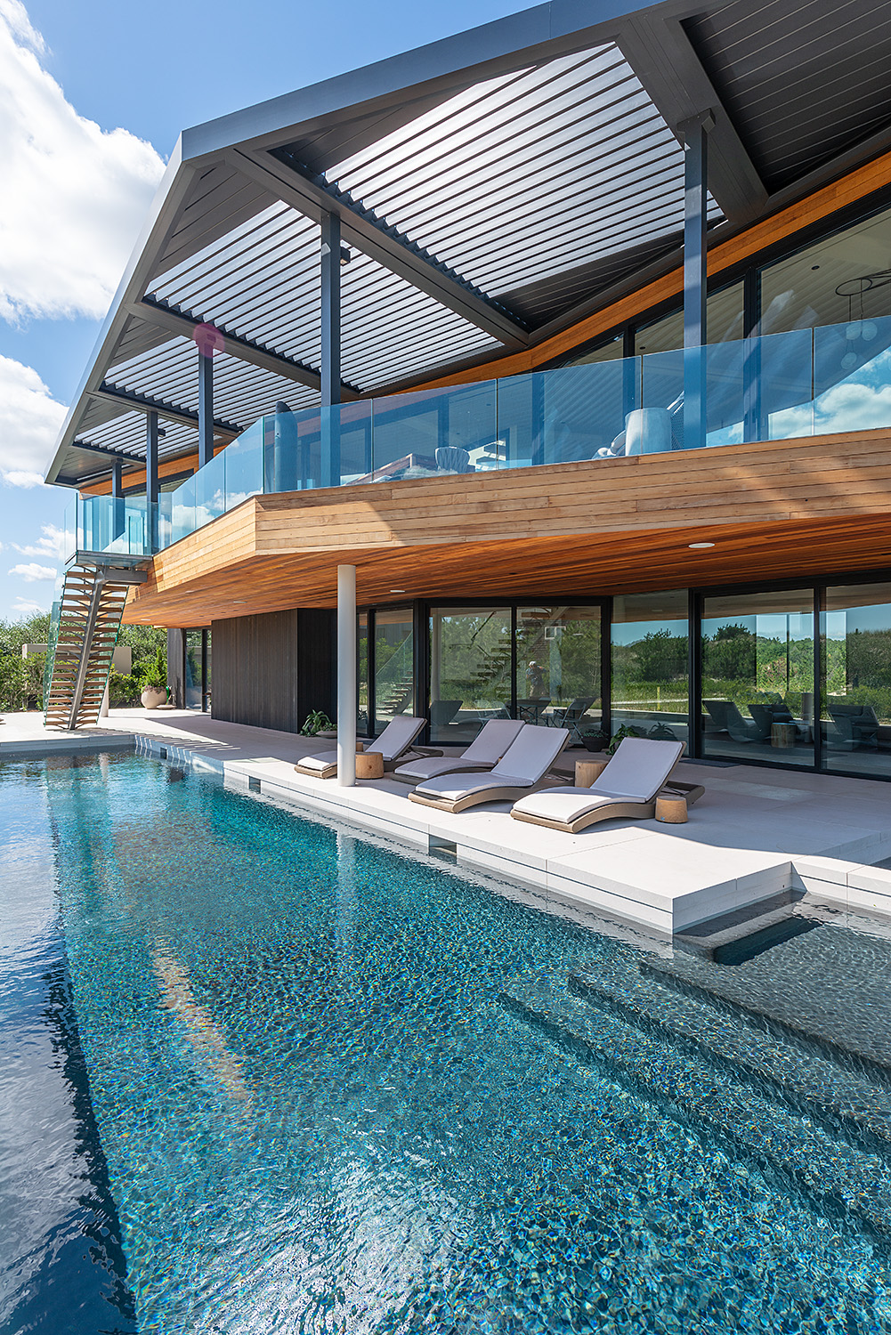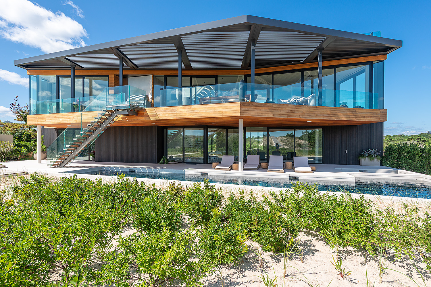 With all the possible hi-tech features and amenities, the house includes a unique operational louver system manufactured in New Zealand and assembled onsite from 560 elements.